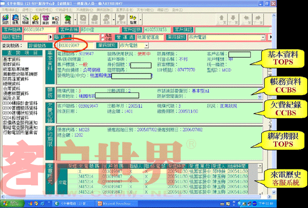 我們推動「CPEP客服流程提升計劃」的重點是在IVR流程中就請客戶自行輸入其欲查詢或辦理的電話號碼,同時客服系統(tǒng)便先透過EAI到后端信息系統(tǒng),查詢出該號碼的核心數(shù)據(jù)(含基本、帳務、欠費記錄、來電歷史等),當客服人員應答時客服系統(tǒng)便立即將這些核心數(shù)據(jù)顯示在屏幕上(如圖一),客服人員便可立即掌握此客戶之相關資料,CPEP如此改善后平均的服務效率提升了11%。