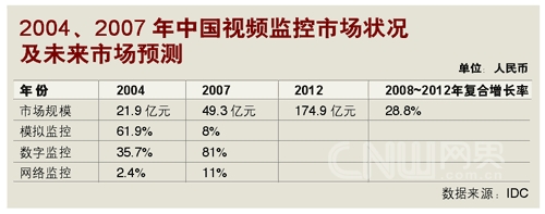 IDC的數(shù)字同樣樂觀。跟據(jù)IDC在2008年的預(yù)測,2008~2012年,中國視頻監(jiān)控市場的年均復(fù)合增長率將達(dá)28.8%,遠(yuǎn)高于IT市場投入的平均增長率。而在模擬、數(shù)字與IP模式(即網(wǎng)絡(luò)監(jiān)控)組成的視頻監(jiān)控市場里,IP的增長率又將高于前二者,成為市場增長的強(qiáng)勁動力。”(注:模擬監(jiān)控是指圖像信號在采集后,通過模擬信號傳輸?shù)姆忾]式視頻監(jiān)控系統(tǒng)模式;數(shù)字監(jiān)控是指圖像信號在采集后,經(jīng)過編碼轉(zhuǎn)化成數(shù)字信號再進(jìn)行傳輸?shù)姆忾]或半封閉式視頻監(jiān)控系統(tǒng)模式;網(wǎng)絡(luò)監(jiān)控是指系統(tǒng)建立在以網(wǎng)絡(luò)為基礎(chǔ)的傳輸平臺的開放式視頻監(jiān)控系統(tǒng)模式)。