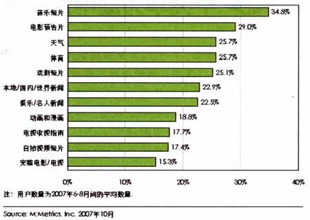 M:Metrics針對美國手機(jī)用戶的研究數(shù)據(jù)顯示,美國手機(jī)用戶在訂閱手機(jī)電視內(nèi)容時偏愛娛樂類的內(nèi)容,其中音樂短片、電影預(yù)告片是用戶需求最大的手機(jī)電視內(nèi)容,另外受到歡迎的是與生活相關(guān)的內(nèi)容及新聞內(nèi)容。