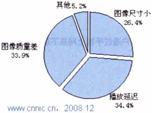 對于手機(jī)視頻用戶而言,目前最大的問題在于視頻圖像的播放延遲問題以及圖像質(zhì)量太差,兩者比例分別為 34.4%和33.9%。引起這兩種問題的最大因素是電信運(yùn)營商的網(wǎng)絡(luò)問題,目前的2.5G和2.75G網(wǎng)絡(luò)對于數(shù)據(jù)的快速傳輸仍有很大的瓶頸。