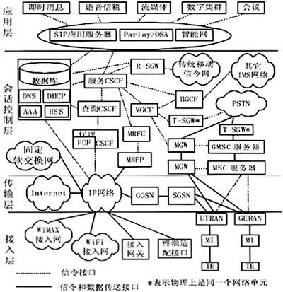 應用層包括SIP應用服務器、Parlay/OSA和智能網(wǎng)。Parlay/OSA提供的標準應用編程接口(API),提供了一個開放的業(yè)務平臺,有利于第三方的業(yè)務提供。具體的業(yè)務,如語音、視頻、即時消息、數(shù)字集群等都可以融合在統(tǒng)一的平臺上。