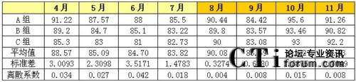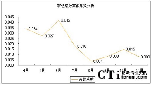 無(wú)論從標(biāo)準(zhǔn)差的走勢(shì)還是從離散系數(shù)的走勢(shì)上來(lái)看,8-11月各班組的績(jī)效得分差距明顯比4-7月的績(jī)效得分差距要小。從另一個(gè)角度來(lái)看,就是該呼叫中心各班組的績(jī)效水平更趨于均衡,呼叫中心人員的整體技能和服務(wù)水平的二極化差異開(kāi)始縮小。