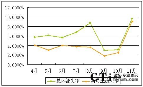 從該中心的運(yùn)營(yíng)數(shù)據(jù)來(lái)看,另一個(gè)發(fā)生明顯變化的就是實(shí)行團(tuán)隊(duì)激勵(lì)后新員工的流失率開(kāi)始明顯增加。以下是我們提取4-11月該呼叫中心員工流失方面的數(shù)據(jù):