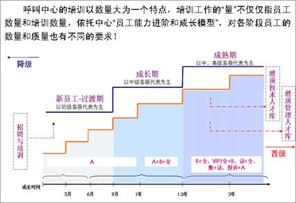 業(yè)務(wù)模塊化后,客服中心對一線客服代表進行分級認證,針對簡單業(yè)務(wù)和復雜業(yè)務(wù)分別設(shè)置首層和二線專席兩類共計8種人員承接梯隊,達到業(yè)務(wù)與人員的全匹配。人員梯隊的設(shè)置對人員的培訓管理和進出機制提出了新的挑戰(zhàn),如何科學界定不同隊列人員的技能標準?如何設(shè)置不同成長時期員工的進出管理機制?