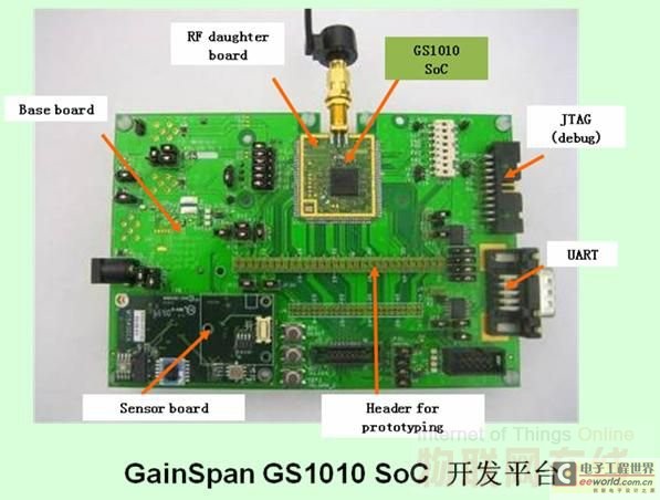 為了幫助客戶縮短開(kāi)發(fā)周期, GainSpan還提供了一整套包括SDK、評(píng)估平臺(tái)、開(kāi)發(fā)平臺(tái)在內(nèi)的軟硬件工具。其軟件棧包括了各種I/O驅(qū)動(dòng)和WLAN固件、RTOS、網(wǎng)絡(luò)棧、系統(tǒng)服務(wù)、WLAN和I/O服務(wù)模塊、各種應(yīng)用編程接口以及應(yīng)用軟件。Parmar聲稱,GS1010的SDK能夠幫助工程師節(jié)約10~12個(gè)月的開(kāi)發(fā)時(shí)間。而硬件開(kāi)發(fā)平臺(tái)則能夠支持溫度、濕度、光敏、壓力、加速度等各種傳感器,并預(yù)留了客戶自選的傳感器接口和調(diào)試以及程序燒錄接口。