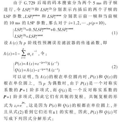 直接從G.729 編碼流中按照量化算法解量化可以得到LSP參數(shù)。由于后段的說話人識(shí)別系統(tǒng)還需要激勵(lì)參數(shù),而在激勵(lì)參數(shù)的計(jì)算過程中經(jīng)過了LSP的插值平滑,所以為了使特征矢量中聲道和激勵(lì)參數(shù)能準(zhǔn)確地對(duì)應(yīng)起來,要對(duì)解量化的LSP參數(shù)采用插值平滑。