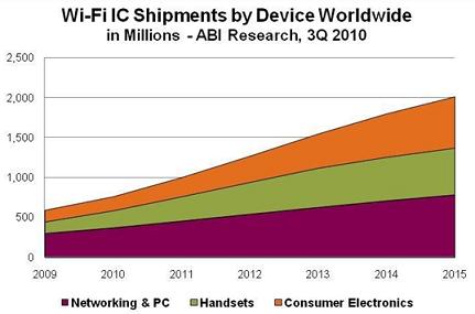 Wi-Fi技術(shù)現(xiàn)已被用于幾乎所有筆記本和上網(wǎng)本、智能電話和游戲設(shè)備。電話、音頻播放器、打印機(jī)、機(jī)頂盒以及其他消費(fèi)類電子設(shè)備對(duì)Wi-Fi技術(shù)的采用率也在不斷增加,來自Wi-Fi聯(lián)盟和多家調(diào)研機(jī)構(gòu)的數(shù)據(jù)印證了這種市場增長趨勢(shì)。2009年,僅在中國銷售的具備Wi-Fi功能的筆記本電腦就達(dá)到800萬臺(tái),全球Wi-Fi設(shè)備認(rèn)證數(shù)量則增加了約50%,消費(fèi)類電子設(shè)備和電話數(shù)量增加了100%以上。截止到2010年7月,消費(fèi)類電子設(shè)施與電話類產(chǎn)品的認(rèn)證數(shù)量已經(jīng)超過了2009年全年數(shù)量,預(yù)計(jì)全年售出約8億臺(tái)Wi-Fi設(shè)備。
