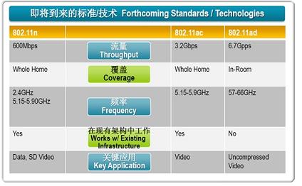 在802.11a/b/g/n等標(biāo)準(zhǔn)不斷刷新更高覆蓋率和數(shù)據(jù)傳輸率的同時(shí),新的標(biāo)準(zhǔn)如802.11ac、802.11ad等都正在嶄露頭角。Michael介紹說,與802.11n 600Mbps的流量相比,ac和ad的流量將分別高達(dá)3.2Gbps和6.7Gbps,頻率范圍分別為5.15GHz~5.9GHz和57GHz~66GHz。從應(yīng)用角度看,ac會(huì)定位在整個(gè)家居多個(gè)室內(nèi)的多媒體內(nèi)容共享;而ad由于傳輸距離有限,用于單個(gè)居室內(nèi)未壓縮高清視頻的短距離傳輸,即可能會(huì)成為HDMI標(biāo)準(zhǔn)的替代者。