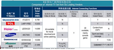 “相比國外廠商認(rèn)為規(guī)則尚不明確,持保守態(tài)度,國內(nèi)的電視機(jī)廠商比國外同行顯得更熱衷網(wǎng)絡(luò)電視!盡ichael表示,“長虹、TCL、海信、康佳及創(chuàng)維等廠商都在2009年推出了各自的網(wǎng)絡(luò)電視系列,網(wǎng)絡(luò)電視被國內(nèi)電視廠商視為開拓藍(lán)海市場,獲取更多利用的機(jī)會(huì)。尤其在三網(wǎng)融合的背景下,網(wǎng)絡(luò)電視在中國被普遍認(rèn)為將有很大前景!
