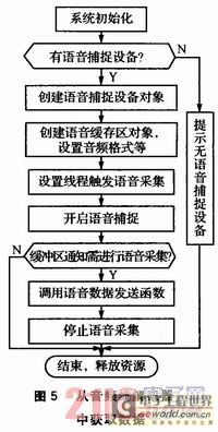 從音頻編解碼器中獲取數(shù)據(jù)時,首先通過UDA1341TS采集語音信號放入語音捕捉緩存區(qū),應(yīng)用程序再從語音捕捉緩沖獲取語音信號并發(fā)送。具體程序流程如圖5所示。