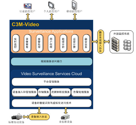 高新興通信最新推出基于云計算的C3M-Video視頻監(jiān)控管理平臺,具有視頻監(jiān)控管理平臺的通用功能和業(yè)務流程,能支持國內(nèi)外主流的視頻設(shè)備。此外,能與高新興現(xiàn)有的動力環(huán)境監(jiān)控系統(tǒng)進行深度的融合,并以此為基礎(chǔ)逐步演繹成一個支撐物聯(lián)網(wǎng)應用的融合監(jiān)控平臺。