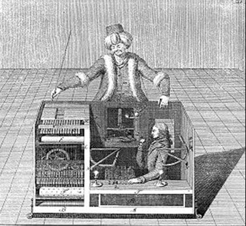 這個(gè)名字源自于臭名遠(yuǎn)揚(yáng)的能下象棋的“自動(dòng)裝置”,它是匈牙利男爵沃爾夫?qū)ゑT·肯佩倫(Wolfgang Von Kempelen)1770年建造的。這個(gè)木制機(jī)器外形像一個(gè)坐在大機(jī)箱前的土耳其魔法師,它能自動(dòng)而快速地下象棋,用復(fù)雜的齒輪和杠桿系統(tǒng)來移動(dòng)棋子。在維也納皇宮的首次表演中,它就迅速擊敗了對(duì)手Cobenzl伯爵,讓在場的皇室成員看得十分高興。從此關(guān)于這個(gè)驚人聰明的機(jī)器人迅速聞名于世,于是肯佩倫帶著它在歐洲各地表演,擊敗了一系列著名的挑戰(zhàn)者,包括拿破侖和本杰明·富蘭克林。直到幾年之后,這個(gè)騙局才被揭穿。原來機(jī)箱里藏了一名象棋大師,他用一個(gè)磁鐵系統(tǒng)來跟蹤對(duì)手的舉動(dòng)并移動(dòng)自己的棋子,這個(gè)人實(shí)際是在模擬一種人工智能。(摘錄自 比特云 )