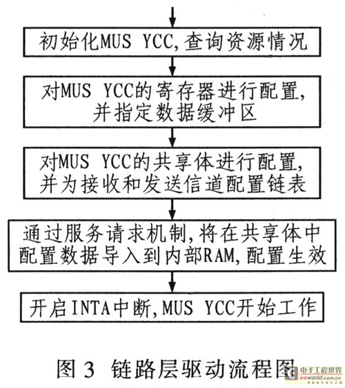 鏈路層HDLC控制器主要完成內(nèi)部寄存器和映射的共享體配置。共享體用于HDLC寄存器的初配、接收和發(fā)送緩沖區(qū)以及時隙映射表的配置。HDLC控制器為每個信道都建立一個消息鏈表,這樣數(shù)據(jù)緩沖區(qū)可以循環(huán)利用。HDLC控制器與成幀器的對應(yīng)關(guān)系決定于HDLC控制器端口映射方式的設(shè)置。其配置流程如圖3所示。