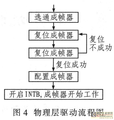 物理層通過地址總線映射配置成幀器,其中PCI橋設(shè)備和成幀器之間經(jīng)過CPLD控制選通。物理層驅(qū)動完成配置成幀器、復(fù)位控制等。成幀器是將E1上的比特流整合成符合規(guī)范的HDLC幀,其中一個標準HDLC幀包括32個時隙,這些時隙可配置映射到HDLC控制器的端口信道,實現(xiàn)2 M、N×64 K、N×8 K高速模式。其配置流程如圖4所示。