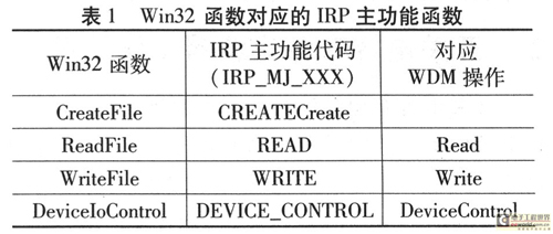 在Windows中,應(yīng)用程序與WDM通信的實現(xiàn)過程:應(yīng)用程序應(yīng)先獲得設(shè)備句柄GUID碼,然后利用CreateFile函數(shù)打開設(shè)備,通過 DeviceIoControl函數(shù)傳遞控制代碼參數(shù)和WDM進行通信,包括從WDM中讀取數(shù)據(jù)和寫數(shù)據(jù)給WDM兩種情況,也可利用ReadFile從 WDM中讀取數(shù)據(jù)或用WriteFile寫數(shù)據(jù)給WDM:當(dāng)下層驅(qū)動有觸發(fā)事件時,就需要Event事件通知上層軟件。當(dāng)應(yīng)用程序退出時,CloseHandle則關(guān)閉設(shè)備,這將產(chǎn)生對應(yīng)于此設(shè)備對象的相應(yīng)IRP消息。這種關(guān)系如表1所列。