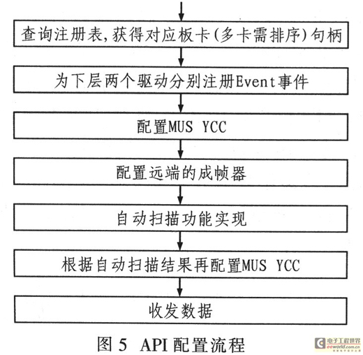 由于E1數(shù)據(jù)采集卡的MUSYCC控制器是PCI多功能設(shè)備,所以應(yīng)用程序應(yīng)當(dāng)合理調(diào)整兩個功能驅(qū)動程序的控制順序,實現(xiàn)E1數(shù)據(jù)的正常采集。其E1卡應(yīng)用程序(API)的配置流程如圖5所示。