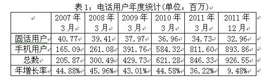政府對(duì)電信市場(chǎng)的開放不僅帶來了電信產(chǎn)業(yè)的快速發(fā)展,激烈的競(jìng)爭(zhēng)也令消費(fèi)者享受到性價(jià)比更高的服務(wù)。近幾年,電話用戶總數(shù)持續(xù)增長(zhǎng),從1999年的2281萬增加到2011年3月底的8億4633萬。截至2011年12月31日,電話用戶總數(shù)達(dá)到9億2655萬,說明從2011年4-12月期間新增用戶8022萬。其中,手機(jī)用戶數(shù)增長(zhǎng)最為顯著,從2007年的1億6509萬增加到2011年3月的8億1160萬,2011年12月底達(dá)到8億9386萬。但是,固話用戶的數(shù)量則從2007年的4077萬減少到2011年3月的3473萬,到2011年12月僅有3269萬。(見表1)