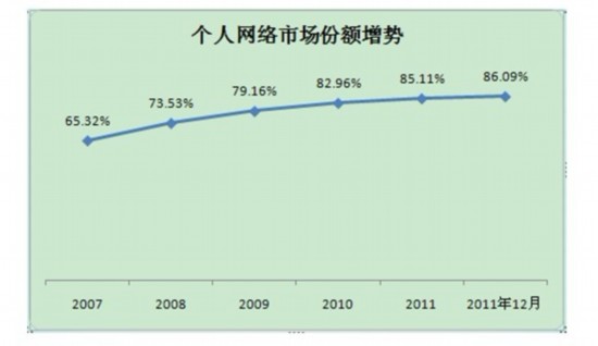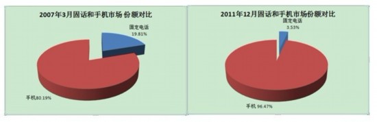 手機(jī)的增長(zhǎng)非常顯著,從2007年開始,手機(jī)用戶每年以42.7%的速度增長(zhǎng)。手機(jī)的市場(chǎng)份額從2007年的80.19%增加到2011年12月的96.47%,現(xiàn)在已經(jīng)遠(yuǎn)遠(yuǎn)超過了固話。