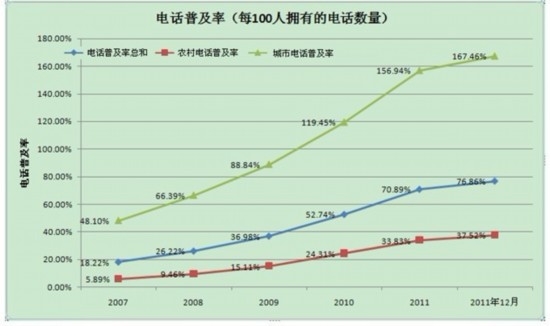 城市電話普及率從2007年3月的48.10%,增長(zhǎng)到2011年3月的156.94%,到2011年12月底達(dá)到167.46%。