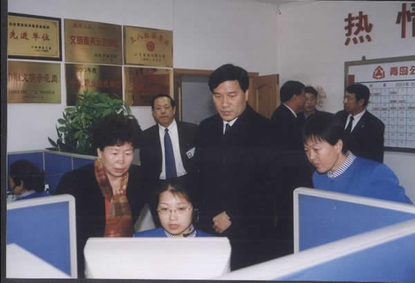 二〇〇二年三月六日 山東省副省長趙克志等領導在市委副書記張旭升等陪同下一行十人來熱線視察工作。