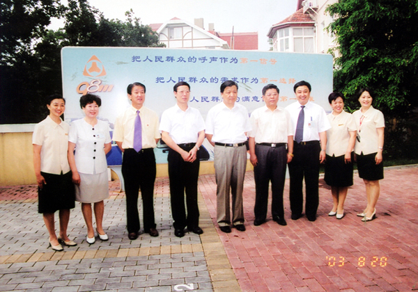 二〇〇三年八月二十日 中共中央政治局委員、書記處書記、中宣部部長劉云山、副部長胡振民在山東省委書記張高麗、省委常委、青島市委書記杜世成等領導陪同下視察96111熱線。