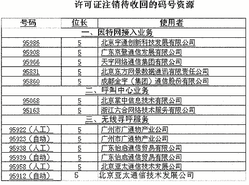 信產(chǎn)部公告稱,對這次經(jīng)營許可證注銷涉及的13個(gè)號碼,將依據(jù)《電信網(wǎng)碼號資源管理辦法》(信息產(chǎn)業(yè)部令第28號)將予以收回。(高飛)