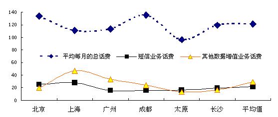 調(diào)查數(shù)據(jù)顯示,在所訪6個(gè)城市的手機(jī)用戶中,過去三個(gè)月平均每個(gè)月的話費(fèi)總額平均為121.3元(以北京和成都的用戶平均總話費(fèi)較高),其中短信話費(fèi)平均每月為14.0元,而其它數(shù)據(jù)增值業(yè)務(wù)話費(fèi)平均話費(fèi)為4.8元。