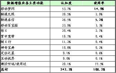 數(shù)據(jù)增值業(yè)務(wù)品牌認(rèn)知度較高的是移動(dòng)夢網(wǎng)、聯(lián)通無限等,而使用率很低