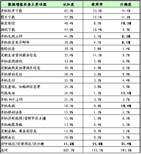 認(rèn)知度:手機(jī)鈴聲下載、圖片下載、收發(fā)彩信、游戲下載、手機(jī)無線上網(wǎng)、手機(jī)收發(fā)電子郵件、彩鈴業(yè)務(wù)、定制生活資訊服務(wù)信息(新聞、天氣預(yù)報(bào)等)等