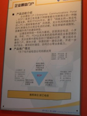近日,中國電信在西安召開了上半年市場工作會議暨新產(chǎn)品展示專題研討會,在此次會議上,各省電信公司分別展示了自己面向市場開發(fā)的新型業(yè)務(wù)。其中,來自浙江電信的一種叫企業(yè)通信門戶ECP(Enterprise Communications Portal)的主推業(yè)務(wù)在展示過程中吸引了眾多目光,引起了其他與會代表的關(guān)注,被認為是中國電信拓展企業(yè)市場空間的最具潛力產(chǎn)品之一。