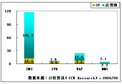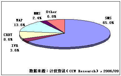 計(jì)世資訊(CCW Research)數(shù)據(jù)顯示,2006年第二季度,移動增值業(yè)務(wù)市場規(guī)模達(dá)到182億元人民幣,移動增值業(yè)務(wù)指依托移動通信網(wǎng)絡(luò)所提供的基本服務(wù)而開展的增值數(shù)據(jù)業(yè)務(wù)服務(wù),市場規(guī)模包括移動運(yùn)營商和服務(wù)提供商(SP)收入。其中SMS、IVR、CRBT、WAP和MMS市場規(guī)模分別為118.3、6.5、15.7、24.8和4.4億元人民幣,其他移動增值業(yè)務(wù)市場規(guī)模12.3億元人民幣,包括JAVA、BREW、移動定位等業(yè)務(wù)。