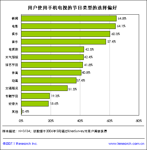 iReserach艾瑞市場咨詢《2007年手機(jī)電視研究報(bào)告》研究結(jié)果顯示,手機(jī)終端價(jià)格將是影響用戶使用手機(jī)電視業(yè)務(wù)的首要驅(qū)動(dòng)因素,其次是手機(jī)電視服務(wù)資費(fèi)標(biāo)準(zhǔn)。另外研究數(shù)據(jù)發(fā)現(xiàn),手機(jī)用戶希望在手機(jī)電視上看到的內(nèi)容類別情況:新聞、電影、娛樂和音樂是用戶首要選擇的電視節(jié)目類型,用戶的提及率均在60%以上,另外用戶希望能夠通過手機(jī)看電視劇、天氣預(yù)報(bào)、綜合節(jié)目和體育等節(jié)目類型。由此發(fā)現(xiàn),新聞、娛樂和生活類資訊是用戶期望手機(jī)電視節(jié)目的重要類型。