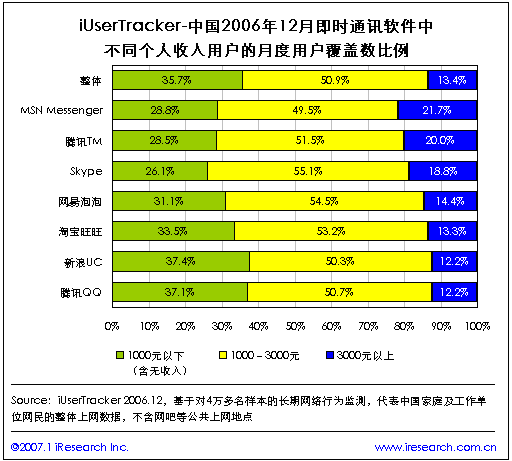 根據(jù)iResearch艾瑞市場(chǎng)咨詢最新推出的網(wǎng)民連續(xù)用戶行為研究系統(tǒng)iUserTracker的最新數(shù)據(jù)表示,2006年12月,即時(shí)通訊軟件的月度總覆蓋用戶數(shù)為10183萬人,比2006年11月上升了0.8%,其中使用騰訊QQ的用戶最多,占94%,MSN Messenger排名第二,占35.6%,淘寶旺旺排名第三,占29%。在最近四個(gè)月內(nèi),即時(shí)通訊類軟件的月度總覆蓋用戶數(shù)總體保持增長。