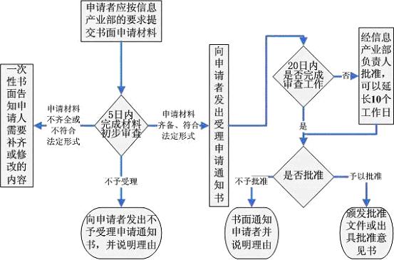 信息產(chǎn)業(yè)部或者省、自治區(qū)、直轄市通信管理局應當自發(fā)出受理申請通知書之日起20個工作日內(nèi)完成審查工作,作出批準或不予批準的決定。20個工作日內(nèi)不能做出決定的,經(jīng)信息產(chǎn)業(yè)部或者省、自治區(qū)、直轄市通信管理局負責人批準,可以延長10個工作日,并將延長期限的理由告知申請人。予以批準的,出具正式批準文件;不予批準的,書面通知申請人并說明理由。