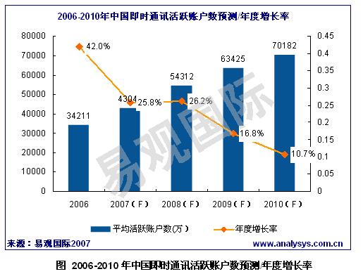 2007年中國即時(shí)通訊活躍賬戶數(shù)將達(dá)4.3億,未來3年增幅呈現(xiàn)下滑趨勢