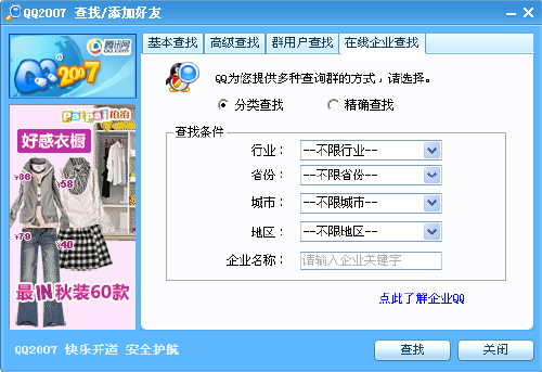 用戶點(diǎn)擊QQ面板上的"查找"圖標(biāo),將會(huì)發(fā)現(xiàn)在原有的3種查找通道外,新增了"企業(yè)用戶查找"功能。QQ用戶可以選擇分類查找,通過行業(yè)、省份、城市、地區(qū)等的匹配,來找到最符合查找條件的企業(yè),同時(shí)也可以通過關(guān)鍵字來模糊查找目標(biāo)企業(yè)。如果確知企業(yè)的全稱或者企業(yè)QQ賬號(hào),則可以一步到位精確查找到目標(biāo)企業(yè)。