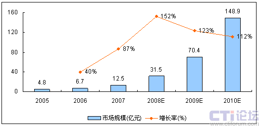 馳昂咨詢(Sinotes)發(fā)布的《2007-2008年中國移動增值業(yè)務(wù)市場研究年度報告》顯示,截止至2007年底,中國移動即時通信(IM)市場規(guī)模已經(jīng)達(dá)到12.5億元。而隨著3G時代的來臨,在電信運營商的積極推動下,國內(nèi)移動IM市場必將步入快速增長期,預(yù)計未來三年增長率都將在100%以上。