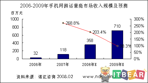 諾達(dá)咨詢報(bào)告《2008手機(jī)網(wǎng)游報(bào)告—產(chǎn)業(yè)發(fā)展與競(jìng)爭(zhēng)策略》認(rèn)為,手機(jī)網(wǎng)絡(luò)游戲已經(jīng)過(guò)了市場(chǎng)導(dǎo)入期,在未來(lái)幾年將步入快速發(fā)展階段。咨詢研究數(shù)據(jù)表明,2007年手機(jī)網(wǎng)游市場(chǎng)運(yùn)營(yíng)收入達(dá)到了1.18億元人民幣,今年將達(dá)3.58億元人民幣,到2009年市場(chǎng)規(guī)模有望突破7.0億元人民幣。