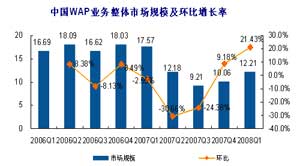 中國WAP業(yè)務整體市場規(guī)模及環(huán)比增長率(來源:易觀國際)