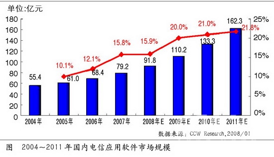 3G是中國未來通信建設(shè)的重點。隨著3G發(fā)展趨勢逐漸明朗化,為了有效地對3G網(wǎng)絡(luò)進(jìn)行支撐和管理,針對3G業(yè)務(wù)的IT系統(tǒng)建設(shè)也逐漸成為運營商信息化的重點建設(shè)項目。BSS、OSS和MSS將成為這次建設(shè)的主要方向,今后相當(dāng)長的一段時間內(nèi),計費賬務(wù)系統(tǒng)、經(jīng)營分析與決策系統(tǒng)、網(wǎng)絡(luò)資源管理系統(tǒng)、客戶關(guān)系管理系統(tǒng)等將成為國內(nèi)電信運營商建設(shè)或規(guī)劃的重點。根據(jù)計世資訊調(diào)查顯示,2007~2011年,在3G建設(shè)全面展開后,電信應(yīng)用軟件市場的市場規(guī)模累積將達(dá)到將近500億元的市場份額。