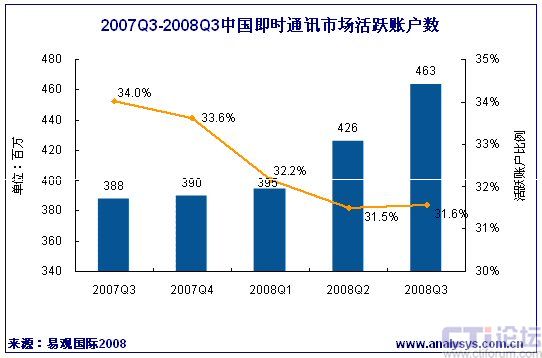 易觀國際(Analysys International)近期發(fā)布《2008年第3季度中國即時通信市場季度監(jiān)測》數(shù)據(jù)顯示,2008年第3季度中國即時通訊市場活躍賬戶數(shù)環(huán)比增長9%,達(dá)到4.63億,比去年同期增長19%,繼續(xù)保持穩(wěn)定的增長勢頭。