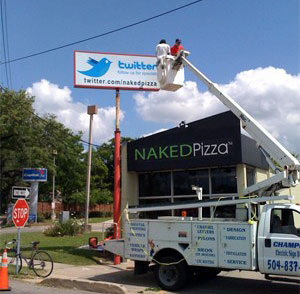 繼華爾街日?qǐng)?bào)、紐約時(shí)報(bào)、英國(guó)衛(wèi)報(bào)等報(bào)紙利用起Twitter后,最近,據(jù)Techcrunch網(wǎng)站消息稱(chēng),美國(guó)新奧爾良名為NakedPizza的比薩店,不僅在Twitter上注冊(cè)了帳號(hào),而且拆除了之前標(biāo)有訂餐電話的店前廣告牌,取而代之的是一塊以Twitter為主題的新廣告牌。