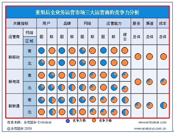 盡管產(chǎn)業(yè)鏈完備程度相差較為明顯,但運(yùn)營(yíng)商各自業(yè)務(wù)與用戶服務(wù)運(yùn)營(yíng)能力對(duì)3G時(shí)常的發(fā)展影響也至關(guān)重要,根據(jù)易觀國(guó)際Enfodesk發(fā)布的《國(guó)內(nèi)運(yùn)營(yíng)商3G業(yè)務(wù)發(fā)展策略研究系列—中國(guó)3G市場(chǎng)現(xiàn)狀與發(fā)展策略概述》報(bào)告顯示,在發(fā)展3G的過程中,三大運(yùn)營(yíng)商各自有一定的優(yōu)劣勢(shì):