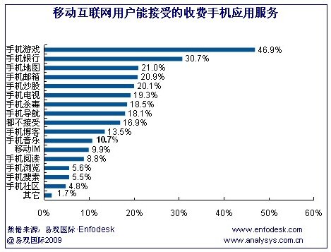 CTI論壇(ctiforum)06月22日消息:據(jù)易觀國際(Analysys International)《中國手機(jī)應(yīng)用市場用戶調(diào)研報(bào)告2009》研究發(fā)現(xiàn),移動互聯(lián)網(wǎng)用戶可接受收費(fèi)的應(yīng)用主要是手機(jī)游戲和手機(jī)銀行/支付,其比例分別為47%和31%,而手機(jī)游戲也是移動互聯(lián)網(wǎng)用戶使用比例較高的手機(jī)應(yīng)用服務(wù)之一。另外,用戶可接受程度較高的還包括手機(jī)郵箱、手機(jī)導(dǎo)航、手機(jī)炒股、手機(jī)電視/視頻以及手機(jī)殺毒等應(yīng)用。而移動互聯(lián)網(wǎng)用戶對于手機(jī)社區(qū)和手機(jī)搜索收費(fèi)的接受度較低。研究發(fā)現(xiàn),移動互聯(lián)網(wǎng)用戶可接受收費(fèi)的應(yīng)用主要是手機(jī)游戲和手機(jī)銀行/支付,其比例分別為47%和31%,而手機(jī)游戲也是移動互聯(lián)網(wǎng)用戶使用比例較高的手機(jī)應(yīng)用服務(wù)之一。另外,用戶可接受程度較高的還包括手機(jī)郵箱、手機(jī)導(dǎo)航、手機(jī)炒股、手機(jī)電視/視頻以及手機(jī)殺毒等應(yīng)用。而移動互聯(lián)網(wǎng)用戶對于手機(jī)社區(qū)和手機(jī)搜索收費(fèi)的接受度較低。