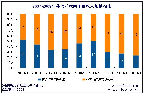 易觀國(guó)際(Analysys International)研究發(fā)現(xiàn),自2007年以來(lái)非官方門戶的流量增長(zhǎng)迅速,為運(yùn)營(yíng)商帶來(lái)較高的流量營(yíng)收。截止到目前,非官方門戶所帶來(lái)的流量費(fèi)用已遠(yuǎn)遠(yuǎn)超過(guò)官方門戶的流量費(fèi)以及用戶所支付的產(chǎn)品服務(wù)費(fèi)用(信息費(fèi))之和。由下圖看以看到,2009年第1季度,中國(guó)移動(dòng)互聯(lián)網(wǎng)官方門戶市場(chǎng)規(guī)模為19.19億(包含流量費(fèi)和信息費(fèi)),而非官方門戶為運(yùn)營(yíng)商所帶來(lái)的流量費(fèi)共達(dá)45.85億元。