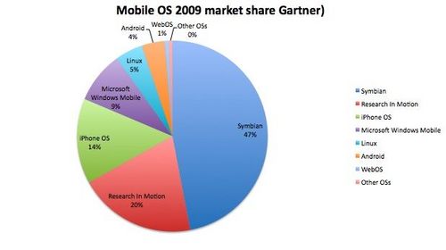根據(jù)Gartner的數(shù)據(jù)顯示,去年共銷售出的智能手機(jī)達(dá)1.72億部,比前年上漲了24%,然而全世界手機(jī)的銷售總量卻并無起色(2008年為12.2億部,而2009年為12.1億部。在去年銷售的所有手機(jī)中,智能手機(jī)占14%,較2008(11%)年有所提升。iPhone盡管去年漲勢迅猛,只占去年各種手機(jī)銷售總量的2%。