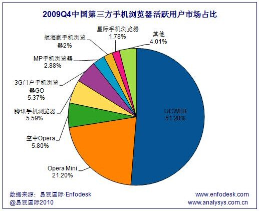 易觀國(guó)際(Analysys International)分析認(rèn)為,2009年4季度中國(guó)手機(jī)瀏覽器市場(chǎng)隨著騰訊、3G門(mén)戶(hù)等實(shí)力強(qiáng)勁的廠(chǎng)商發(fā)力,搶占用戶(hù)的市場(chǎng)競(jìng)爭(zhēng)變得日漸激烈。處于不同手機(jī)瀏覽器陣營(yíng)的廠(chǎng)商都紛紛通過(guò)技術(shù)改進(jìn)與大力度的市場(chǎng)營(yíng)銷(xiāo)廣泛推廣自有產(chǎn)品。