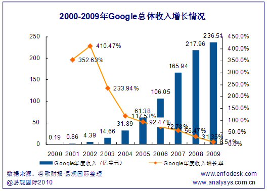 從谷歌的總體營收增長情況可以看出,谷歌雖然保持了相對(duì)平穩(wěn)的整體營收增長態(tài)勢,但是其增長速率已經(jīng)從2001、2002年超過300%的高速增長降低到2009年的8.54%。整體來看,谷歌的營收增長能力已經(jīng)大幅度降低,減緩收入下滑速度的業(yè)務(wù)發(fā)展壓力下,谷歌需要拓展新的市場以重新構(gòu)建業(yè)務(wù)的高速增長。