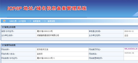 從目前看,WoStore相關(guān)域名可能同樣無(wú)法幸免,盡管目前wostore.cn已被用作中國(guó)聯(lián)通“WoStore應(yīng)用商店”官網(wǎng)域名,并在版權(quán)區(qū)標(biāo)注為“中國(guó)聯(lián)通版權(quán)所有”,但目前域名注冊(cè)商處信息仍然顯示,wostore.cn所有者為“成都融特通信技術(shù)有限公司”。工信部備案資料顯示, wostore.cn于今年1月11日通過(guò)審核備案,目前網(wǎng)站負(fù)責(zé)人同樣是成都融特通信技術(shù)有限公司。