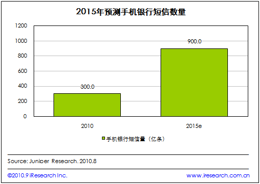 艾瑞咨詢根據(jù)Juniper Research發(fā)布的預測數(shù)據(jù)發(fā)現(xiàn),由于新類型的手機銀行短信提醒的應用,到2015年,全球手機銀行短信量將達到900億條每年,相當于每個手機銀行用戶每隔一天就會收到一條銀行發(fā)來的信息。